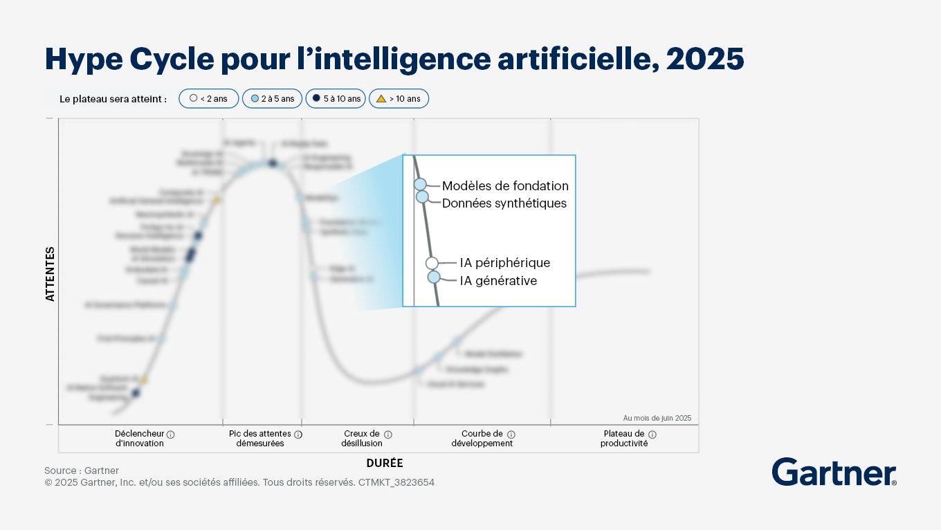 Cette grande déception est représentée par l’apparition progressive des technologies à base d’IA dans le « Creux de la désillusion » des Hype Cycle for Emerging Technologies 2024 et 2025. Cette phase de scepticisme et de désintérêt est loin d’être négative, car elle permet de tempérer l’enthousiasme initial et d’évaluer l’IA de façon plus réaliste et pragmatique.
