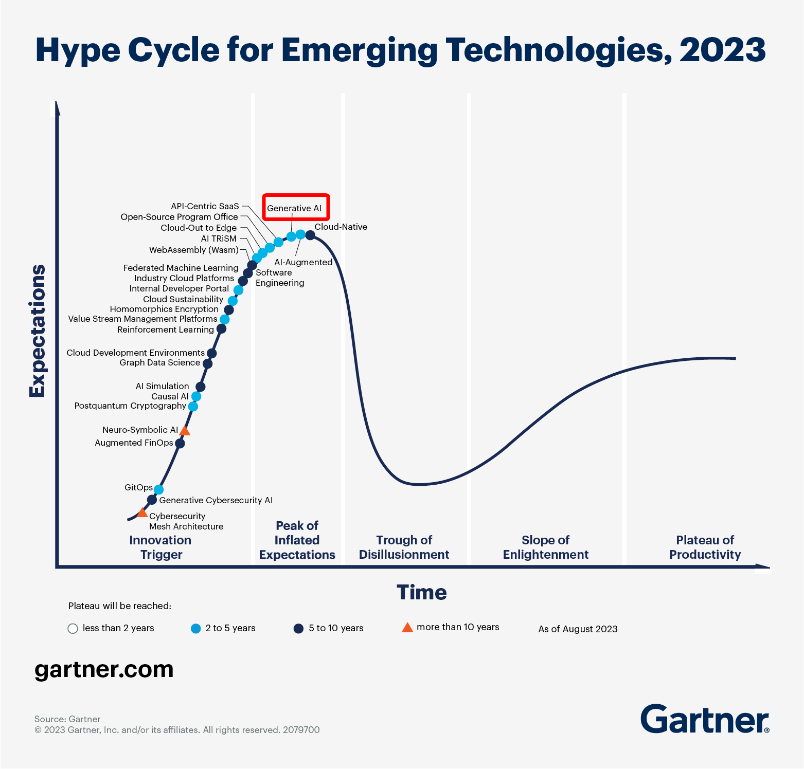 Le Hype Cycle for Emerging Technologies 2023 de Gartner plaçait ainsi l’IA générative au sommet du « Pic des attentes démesurées », ce qui explique la grande déception qui a suivi. Gartner rappelle toutefois que « les technologies présentées dans le Hype Cycle sont à un stade précoce » (Arun Chandrasekaran).