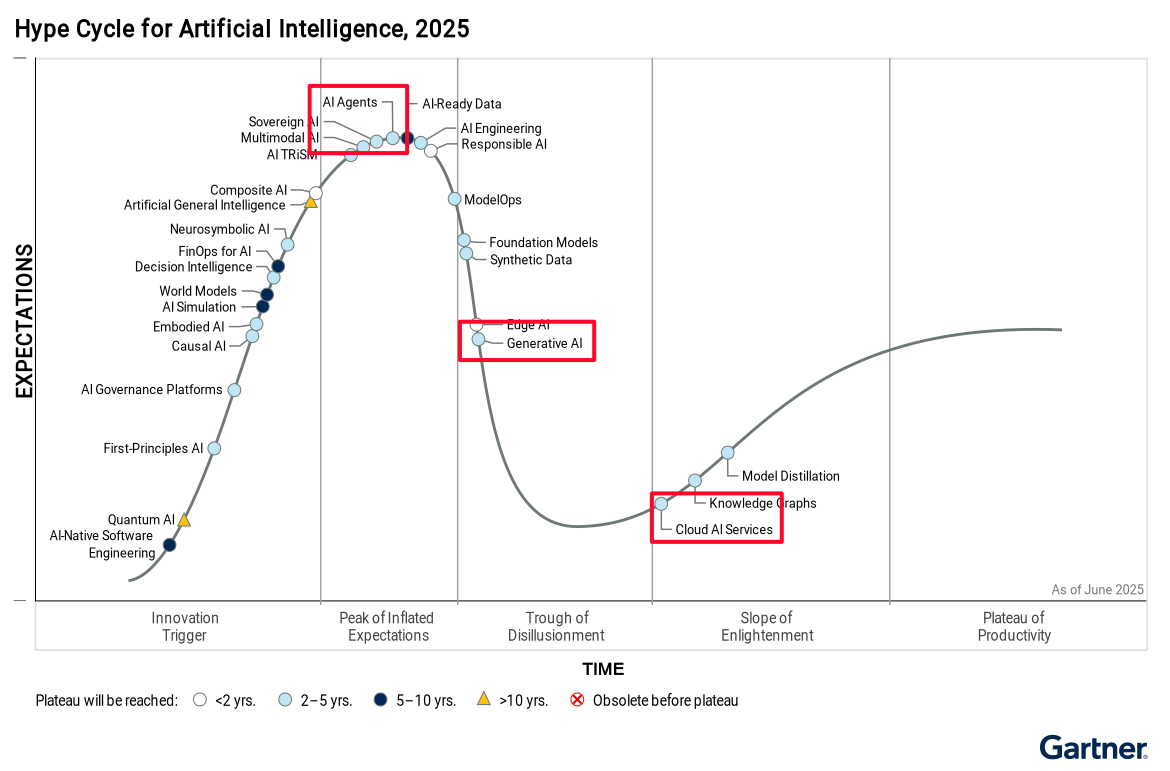 L’IA entre alors en phase de maturation, où ses limites ne sont plus sous-estimées, mais clairement identifiées. D’ailleurs, en 2025, certaines technologies IA, telles que les Cloud AI services, sont entrées dans ce que Gartner appelle la « Courbe de développement », où les entreprises en tirent une valeur tangible. Et il est prévu que plusieurs autres technologies IA devraient passer à cette étape dans un avenir proche (Anbumani, 2024).